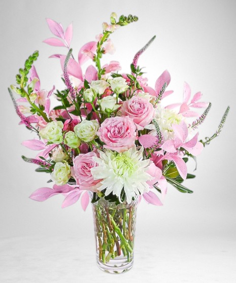 Blooming Through Life is a charming floral design in a soft pink and white palette. Roses, Cremons, Snapdragons, and touches of glittered pink foliage come together to create a bright, uplifting display. Arranged in a clear glass vase, this design adds a cheerful sparkle to any space. Send a delivery and let us bring this beautiful creation straight to your doorstep.