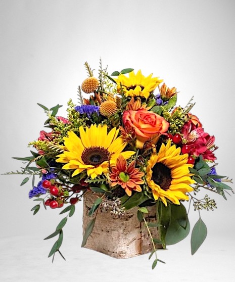 This lovely cube is wrapped in birch bark and filled with a complimenting assortment of fresh fall blooms including roses, sunflowers, alstroemeria, hypericum, statis and fall mums highlighted by various varieties of fragrant eucalyptus. This design will for sure bring a punch of fall color to and setting.