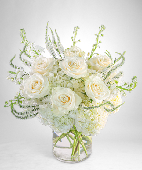 Our Chantilly Elegance design features an elegant white color palette, with White Hydrangea, Roses, Veronica, Stock, and premium foliage. This timeless arrangement exudes a sense of tranquility and sophistication, perfect for any occasion. Its serene beauty makes it a perfect choice for adding a touch of purity and grace to any space. As a trusted local florist, we take pride in every order, offering hand-crafted flower designs delivered directly to the recipient. Our flower shop is committed to providing the highest quality, freshest flowers, and ensuring timely delivery for every arrangement.