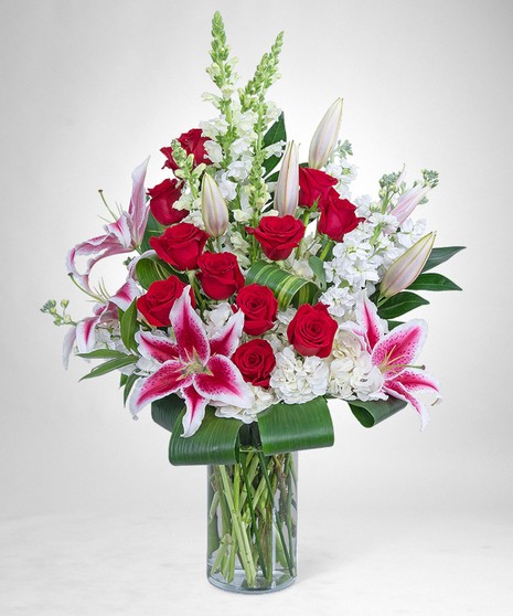Love Story is a "wow" arrangement! It is ultimate beauty and perfection! It features a dozen roses, Hydrangea, Snapdragons, Stock, Aspidistra, and other premium foliage. Roses symbolize love and hope and are the perfect rembrance and gift of love.