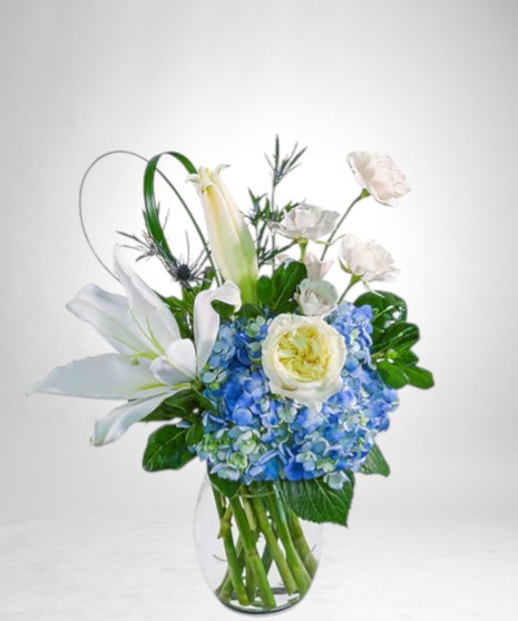 Luna Light is a fresh and airy mix of lilies, hydrangea, roses, and textured greenery arranged in a clear glass vase. The blend of soft white blooms and cool blue tones creates an elegant look that is perfect for flower delivery to celebrate a birthday, send sympathy, or brighten any space from your local florist. Flower varieties and shades may vary slightly due to seasonal availability, while the overall style and color palette remain true to the design.