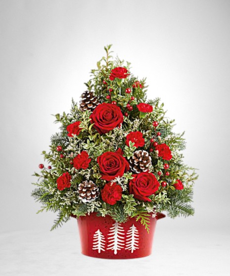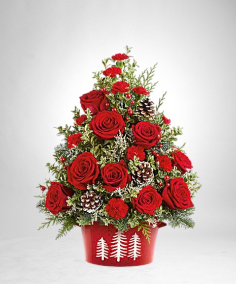 Bring holiday cheer home with Potomac's Holiday Traditions Tree. This festive floral tree of red roses, holiday greens, and pinecones is hand-arranged in Our Snowy Pines Dish-perfect for tabletops or holiday gifting.