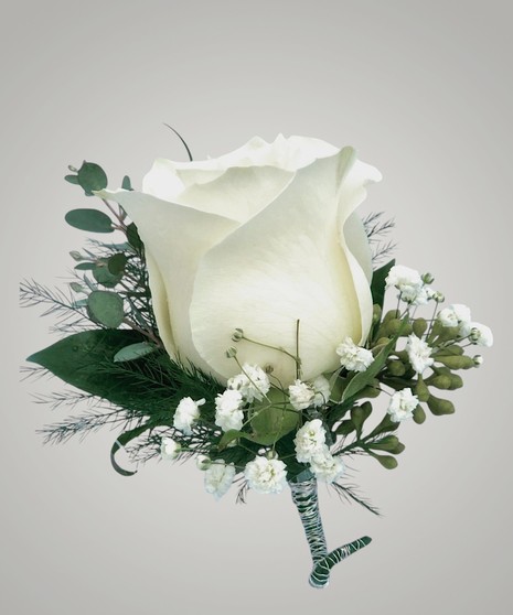 Standard size rose boutonniere with foliage's and baby's breath.